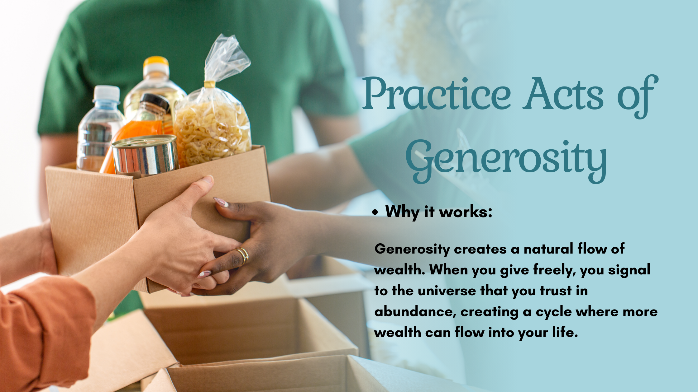 Generosity creates a natural flow of wealth. When you give freely, you signal to the universe that you trust in abundance, creating a cycle where more wealth can flow into your life.