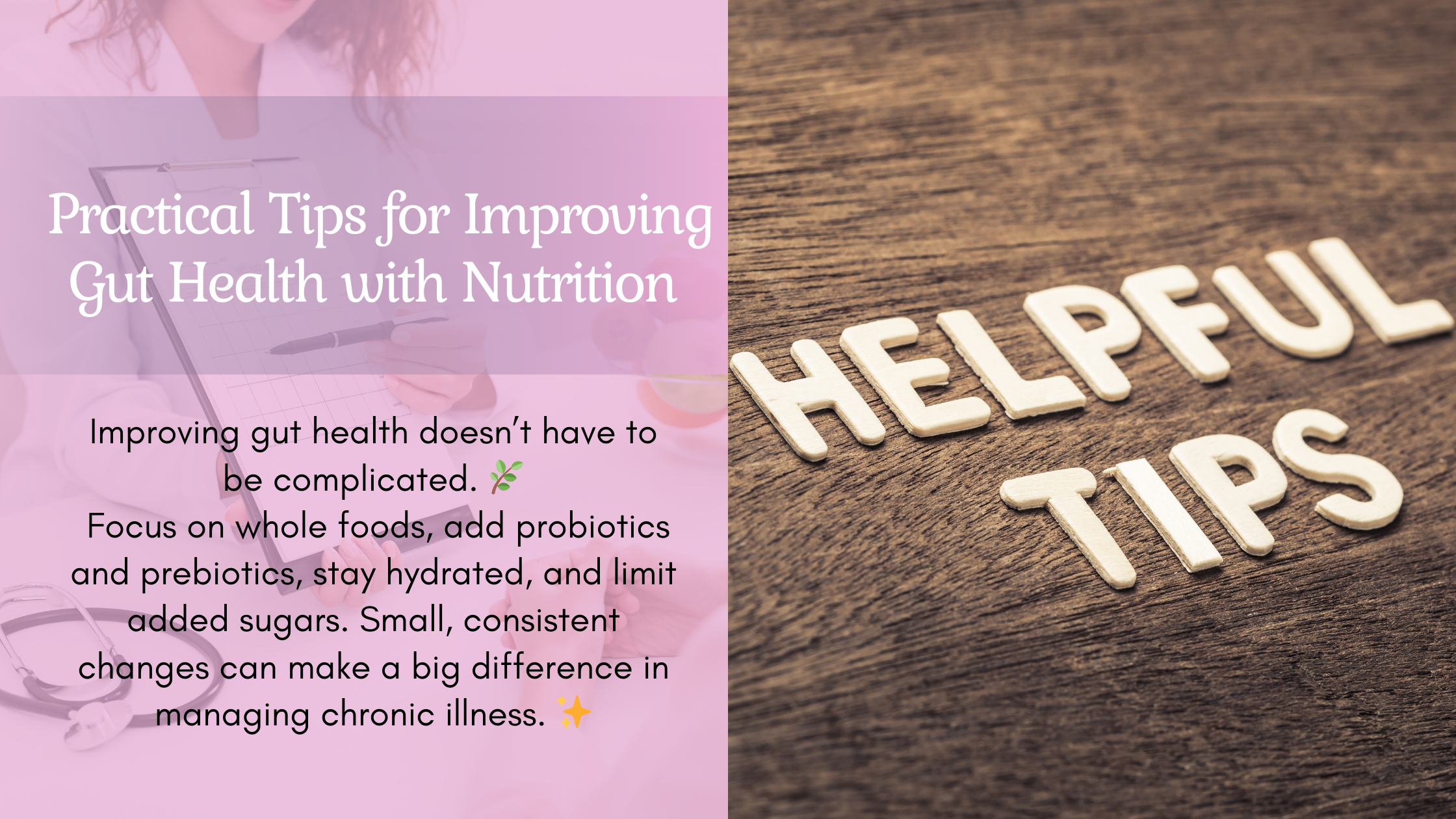 - gMaking dietary changes to improve gut health doesn’t have to be overwhelming. Here are simple steps you can take to optimize your nutrition for chronic illness management: