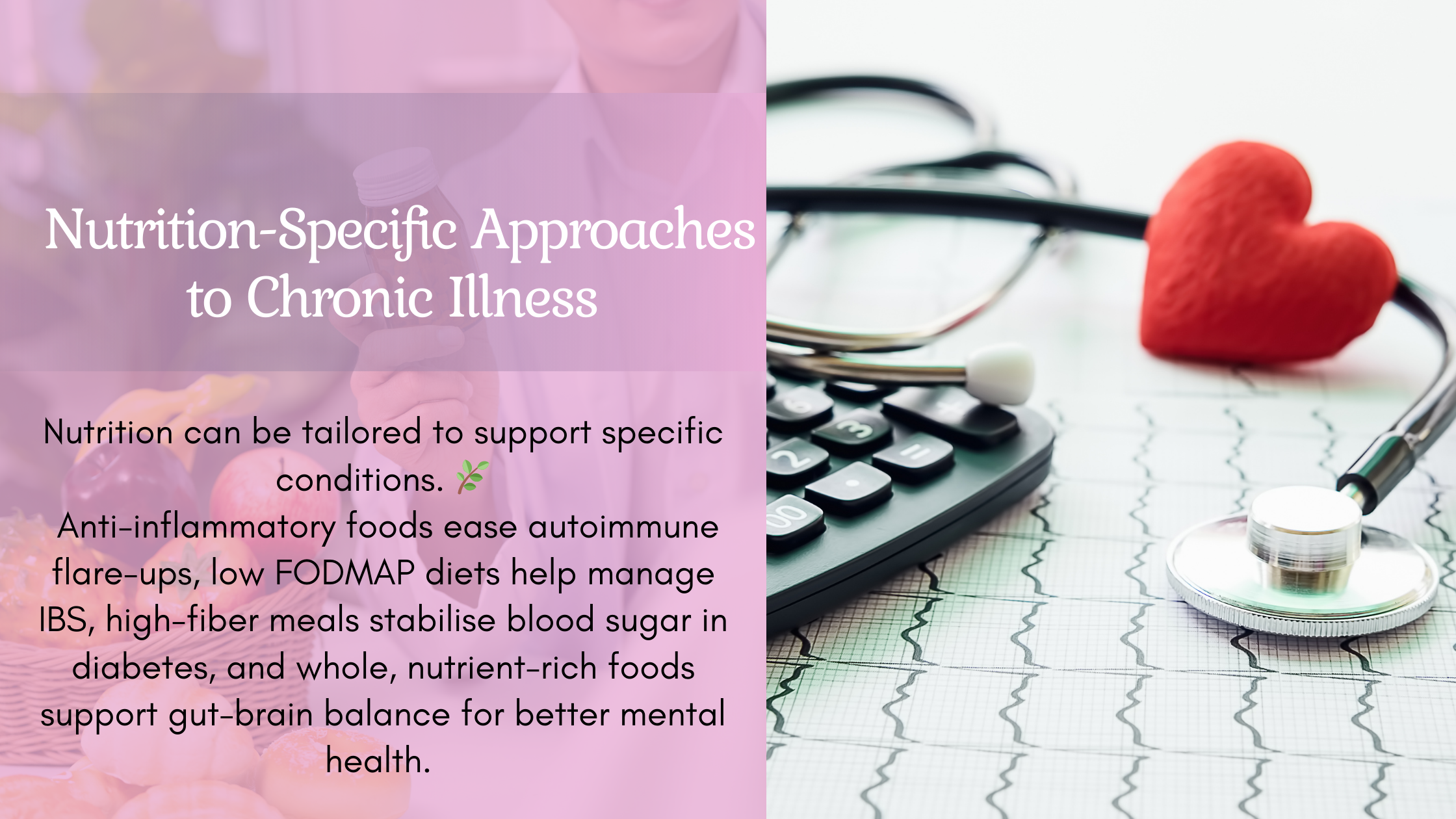 Certain chronic illnesses require specialized approaches to diet and nutrition. Here’s a deeper look at how nutrition can be tailored to specific conditions: